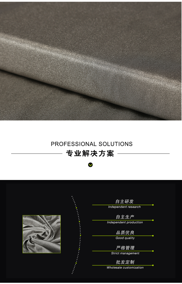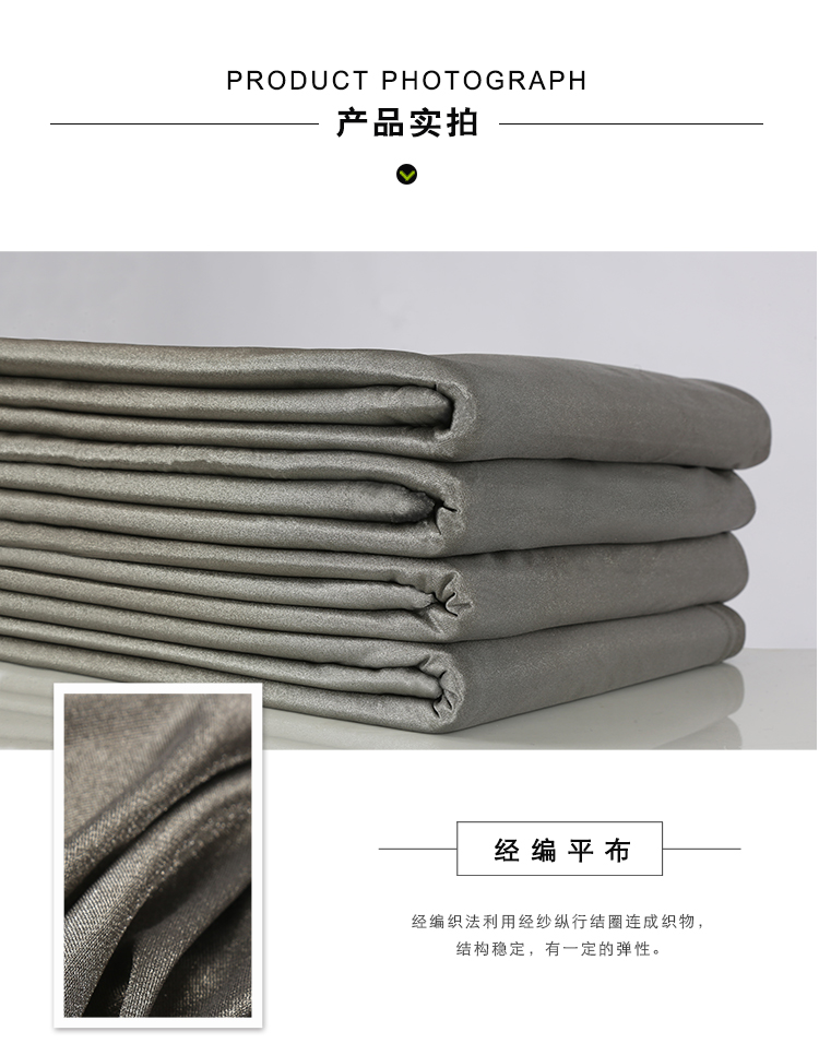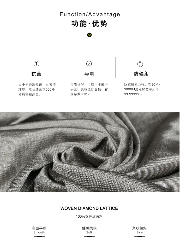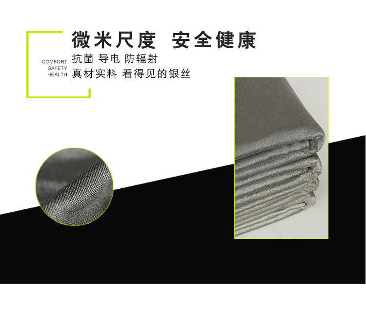 100%銀纖維面料,表面電阻極低,有效屏蔽非電離輻射,抗菌性強,觸感柔軟,親膚性好。