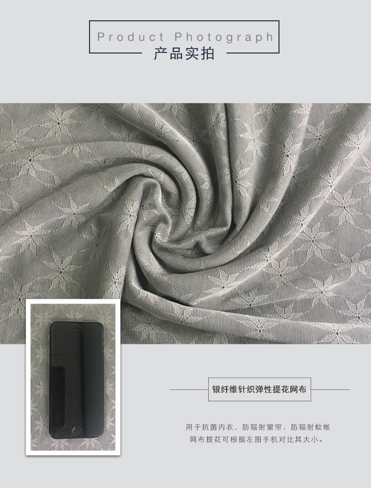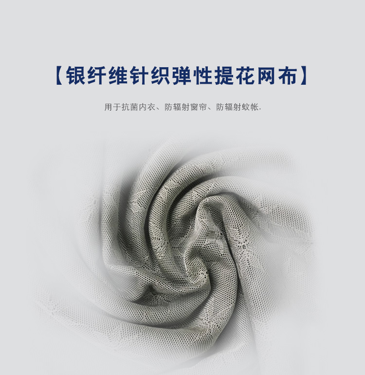 銀纖維針織彈性提花網(wǎng)布,采用超細旦銀纖維織造而成,具有良好的彈性及手感,抑菌率99.99%以上,亦可應用于防輻射窗簾、防輻射蚊帳等。