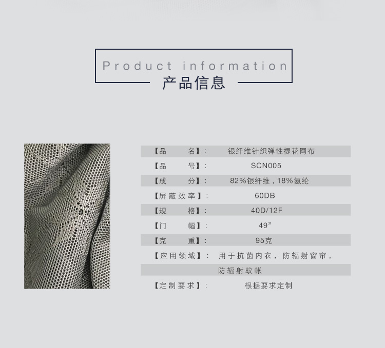 產(chǎn)品名稱: kazhtex江蘇孕婦用電磁屏蔽銀纖維提花網(wǎng)布定制SCN005
