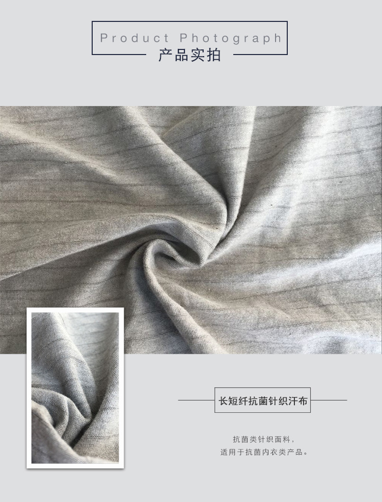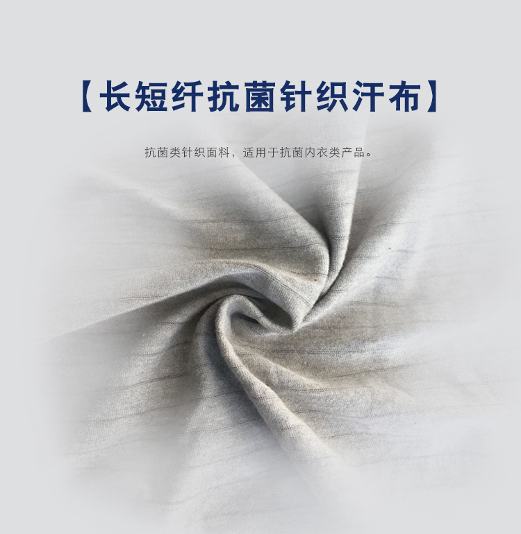 長短纖抗菌針織汗布,高支銀纖維、棉、莫代爾混紡紗織造,并添加進銀纖維長絲,既有優(yōu)良的抗菌性性能,同時具有防輻射功能,高檔功能性內(nèi)衣面料。
