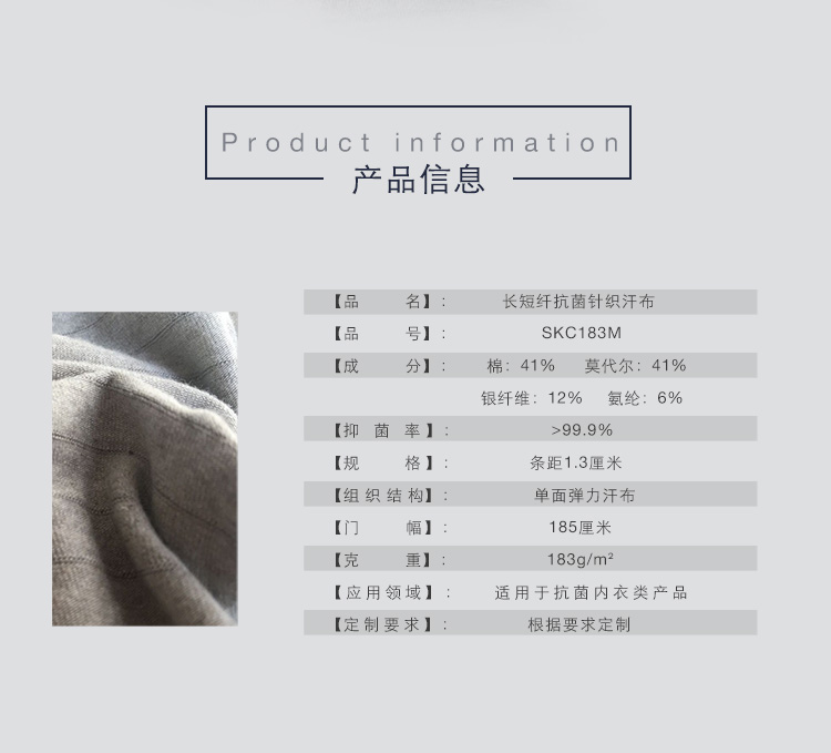 產(chǎn)品名稱: Kazhtex蘇州內(nèi)衣用高抗菌銀纖維針織汗布定制SKC183M