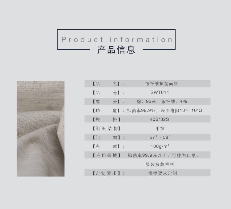 產(chǎn)品名稱: 泰克蘇州家紡用抗菌銀纖維梭織平布批發(fā)SWT011
