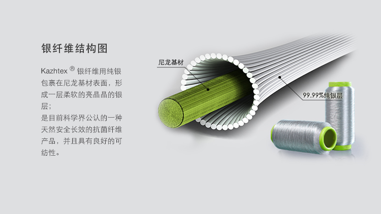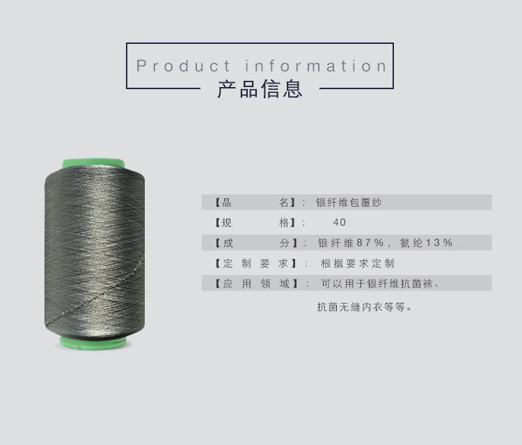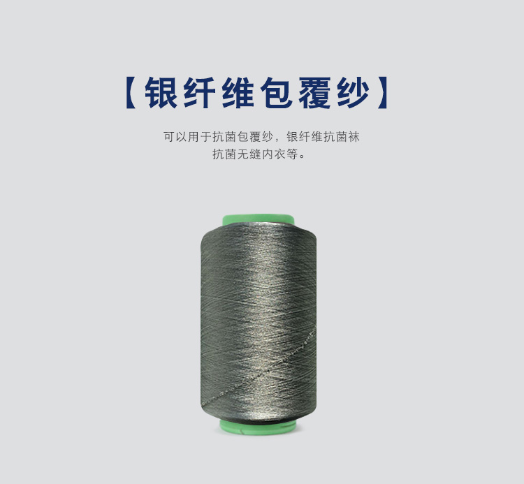 銀纖維氨綸包覆紗為我公司新開發(fā)產(chǎn)品,目前在國際國內(nèi)市場均為空白,使銀纖維的應(yīng)用更為廣泛,性能更加優(yōu)越,產(chǎn)品可以應(yīng)用于抗菌襪,抗菌針織品,導(dǎo)電針織面料,抗菌無縫內(nèi)衣等。