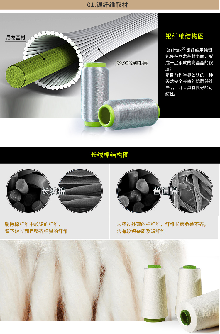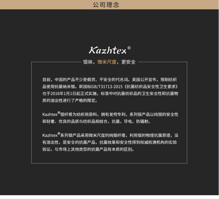 kazhtex銀纖維采用純銀纖維物理抗菌,耐水洗,水洗50次后抑菌率仍可達(dá)99.9%以上,是天然、安全、長(zhǎng)效的抗菌襪,抑菌除臭,預(yù)防腳氣。