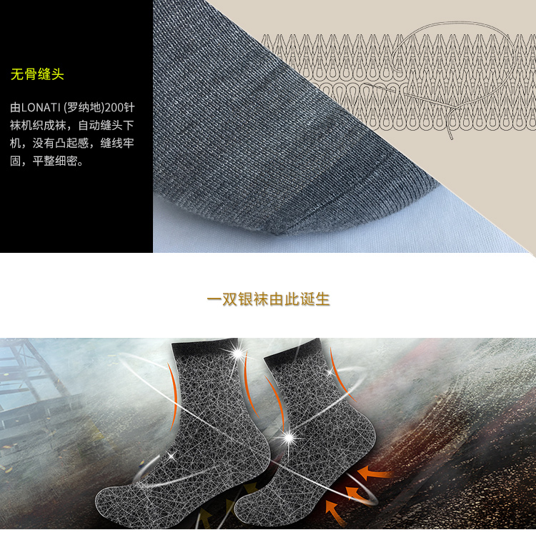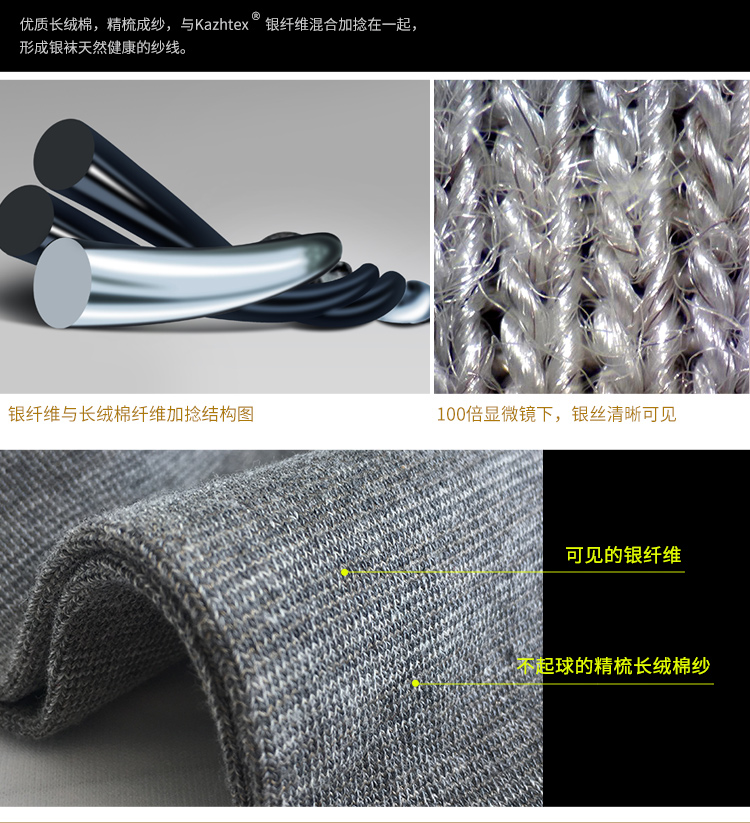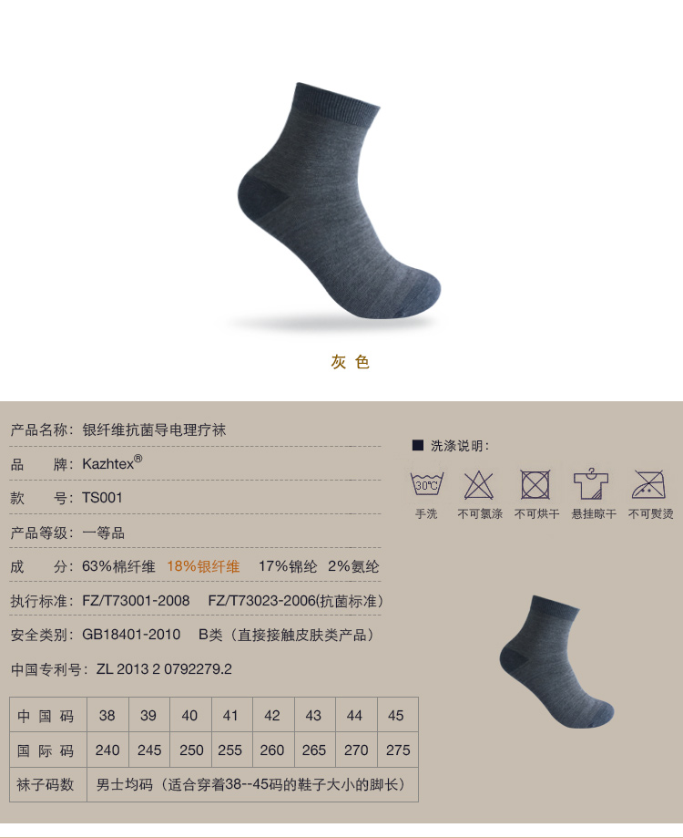 kazhtex銀纖維采用純銀纖維物理抗菌,耐水洗,水洗50次后抑菌率仍可達(dá)99.9%以上,是天然、安全、長效的抗菌襪,抑菌除臭,預(yù)防腳氣;接地理療。