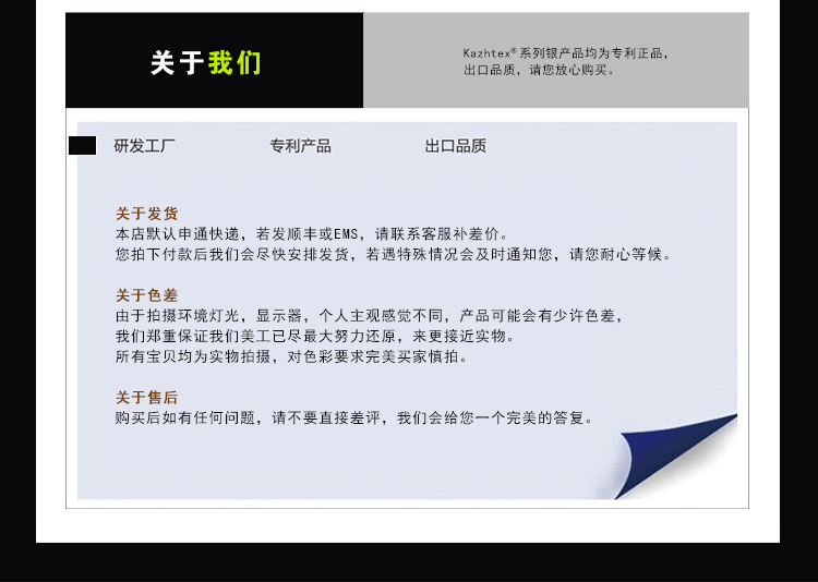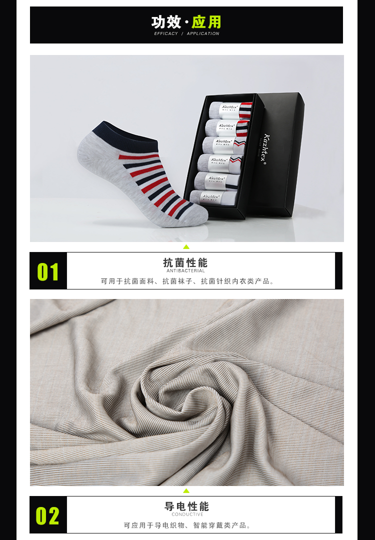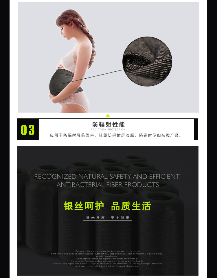 銀纖維FDY為我公司主要產(chǎn)品,目前在國際國內(nèi)市場應(yīng)用廣泛,銀纖維FDY具有良好的抑菌性和導(dǎo)電性,廣泛應(yīng)用于紡織品抗菌、導(dǎo)電、防輻射領(lǐng)域,產(chǎn)品可以用于抗菌面料,導(dǎo)電面料,抗菌無縫內(nèi)衣等。