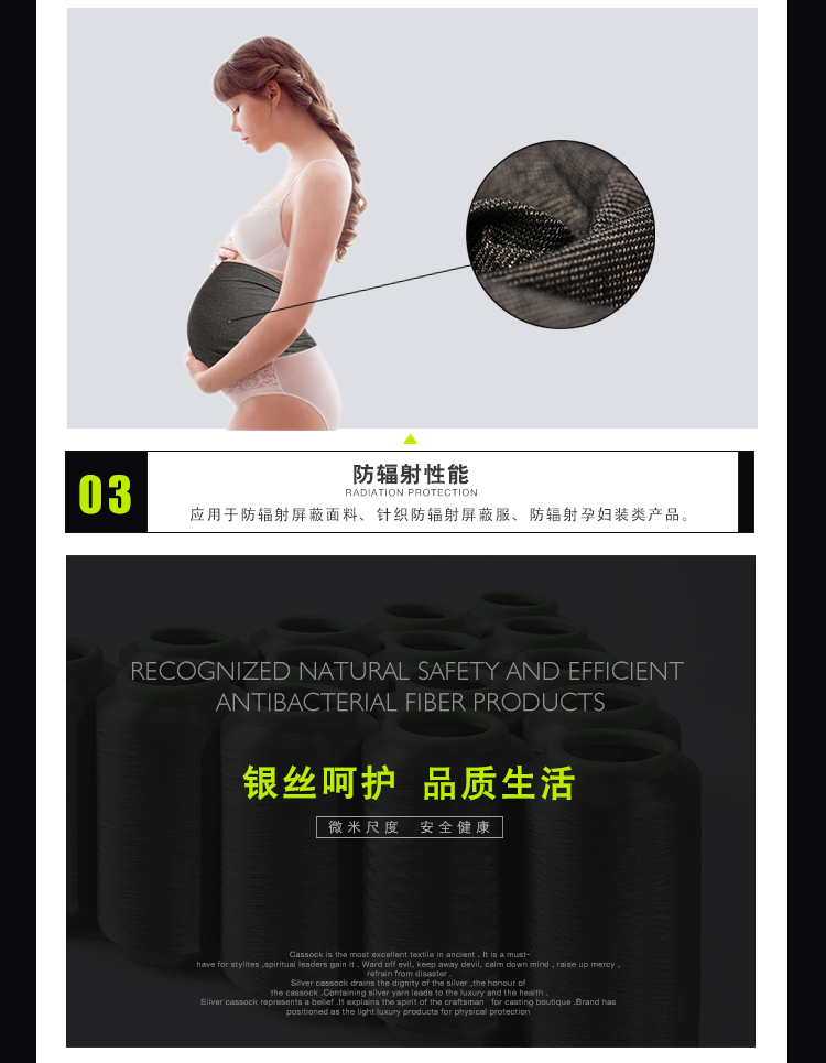 銀纖維FDY為我公司主要產(chǎn)品,目前在國際國內(nèi)市場應(yīng)用廣泛,銀纖維FDY具有良好的抑菌性和導(dǎo)電性,廣泛應(yīng)用于紡織品抗菌、導(dǎo)電、防輻射領(lǐng)域,產(chǎn)品可以用于抗菌面料,導(dǎo)電面料,抗菌無縫內(nèi)衣等。
