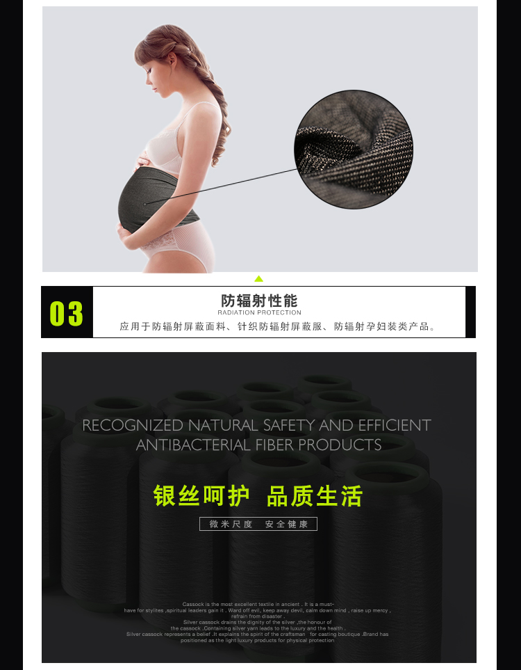 銀纖維具有優(yōu)良的抗菌、導(dǎo)電、防輻射的功能,銀纖維DTY在紡織品方面的應(yīng)用更為廣泛,在保證銀纖維固有特性的前提下,提供織物更優(yōu)良的手感以及舒適度。