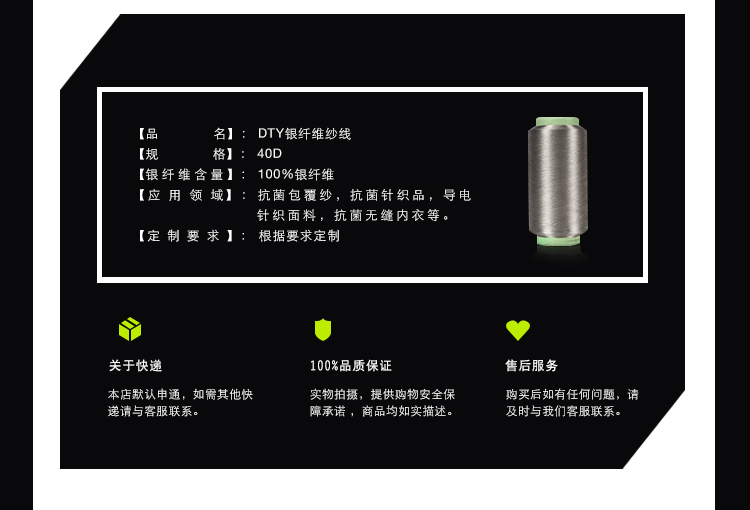 銀纖維DTY為我公司新開發(fā)產(chǎn)品,目前在國際國內(nèi)市場均為空白,銀纖維DTY比FDY更柔軟蓬松,具有高彈纖維的特性,應(yīng)用范圍更為廣泛,性能更加優(yōu)越,產(chǎn)品可以應(yīng)用于抗菌包覆紗,抗菌針織品,導(dǎo)電針織面料,抗菌無縫內(nèi)衣等。