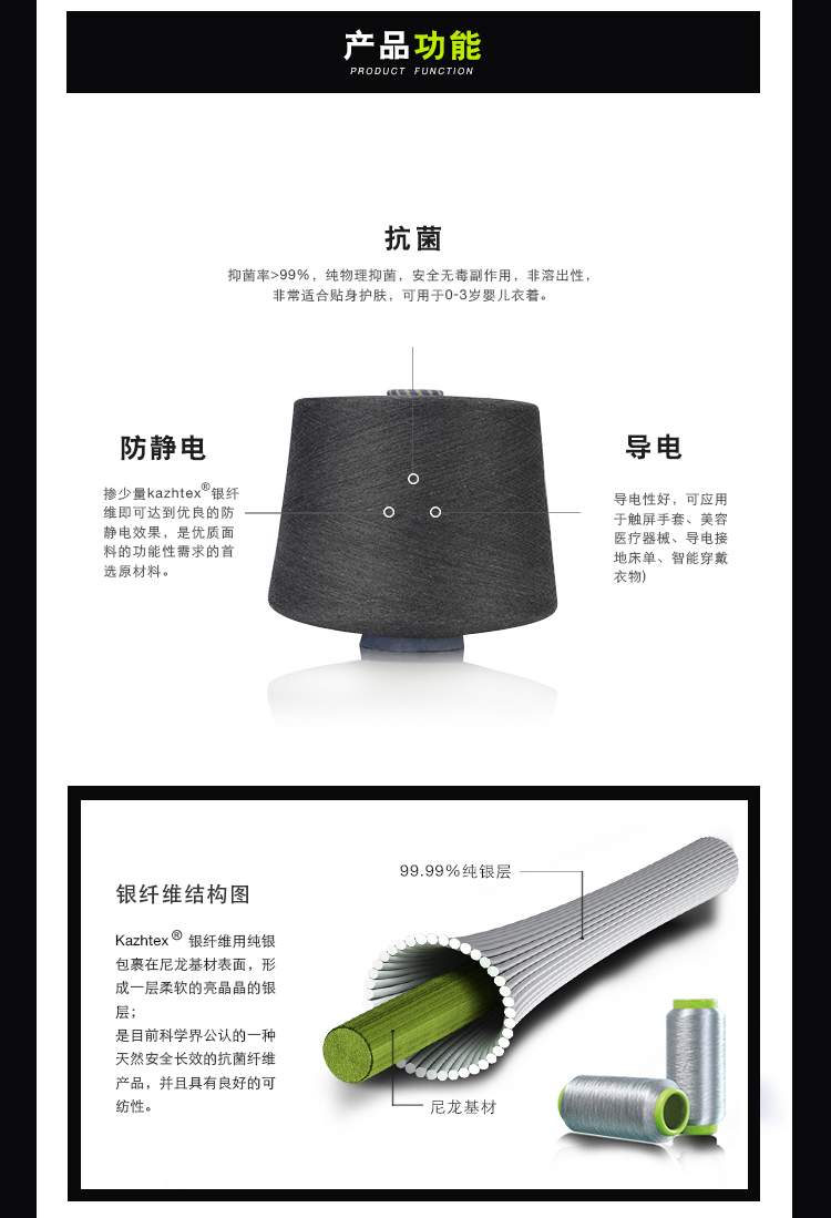 Kazhtex(銀裟)技術特色:多項銀纖維發(fā)明專利,國內(nèi)獨創(chuàng)銀纖維DTY制備技術,使銀纖維在紡織品方面的應用更為廣泛。