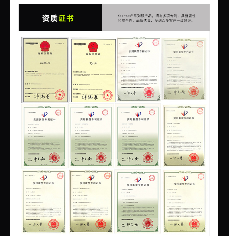 Kazhtex(銀裟)實力特色:從業(yè)十四年,江蘇省高新技術企業(yè),公司團隊成員大部分畢業(yè)于國內(nèi)紡織專業(yè)院校,專注銀纖維應用技術,經(jīng)驗豐富。