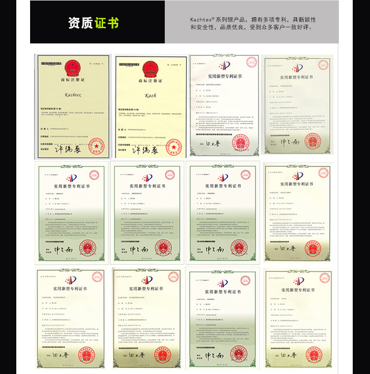 Kazhtex(銀裟)技術特色:多項銀纖維發(fā)明專利,國內獨創(chuàng)銀纖維DTY制備技術,使銀纖維在紡織品方面的應用更為廣泛。