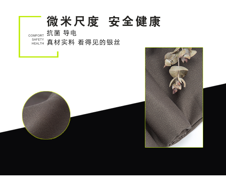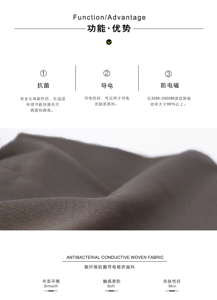 導(dǎo)電防輻射梭織面料,電阻低,抗菌性強(qiáng),觸感柔軟,親膚性好。