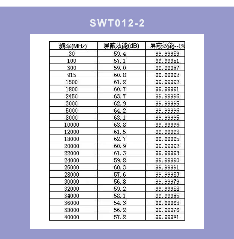 屏蔽率:54.3-64.2DB 30MHZ-40GHZ