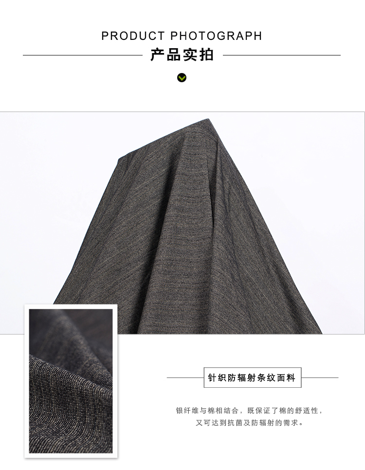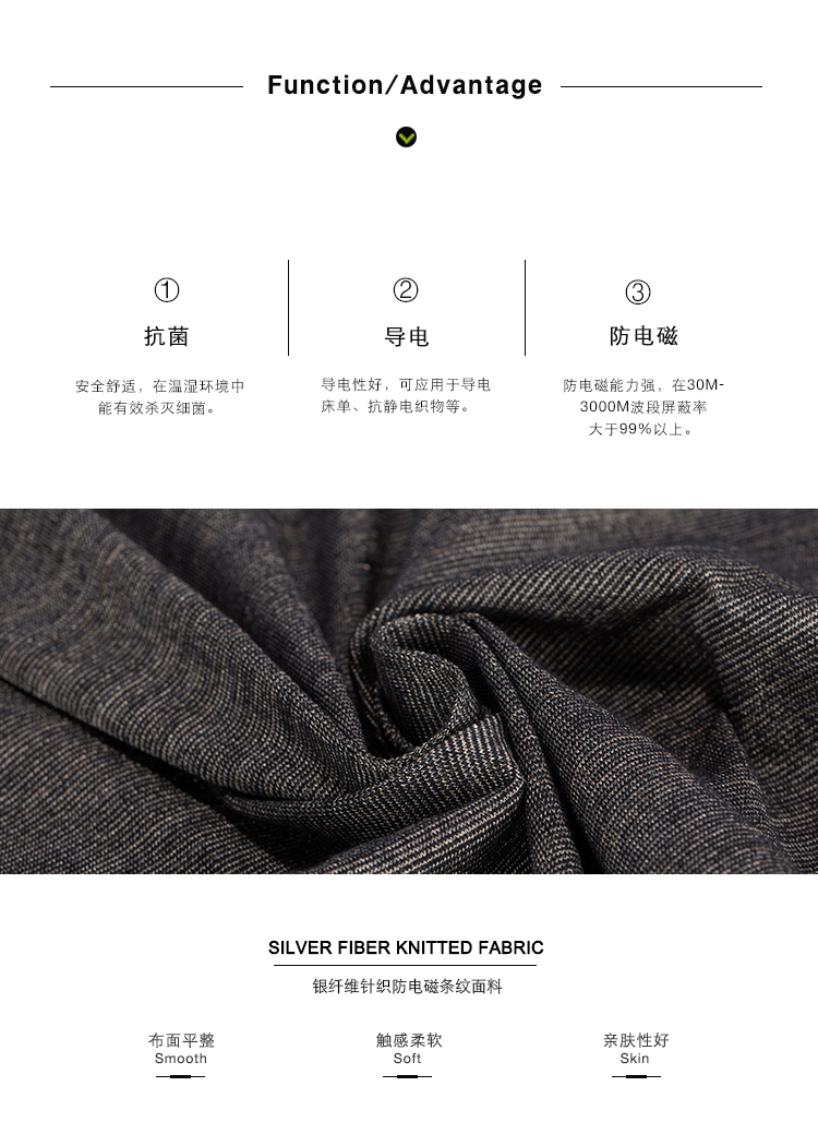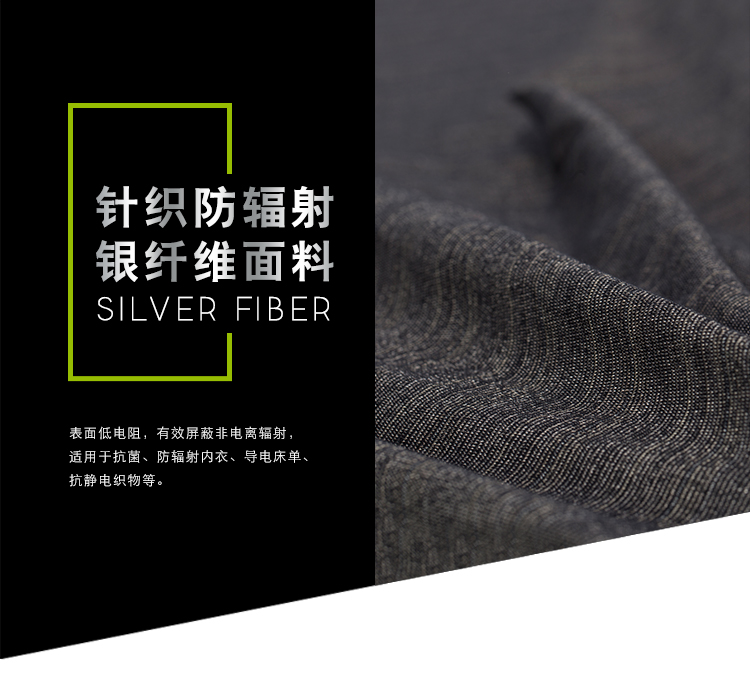 銀纖維針織面料,高支銀纖維棉混紡紗織造,具有優(yōu)異的抗菌性,防輻射功能,高檔功能性面料